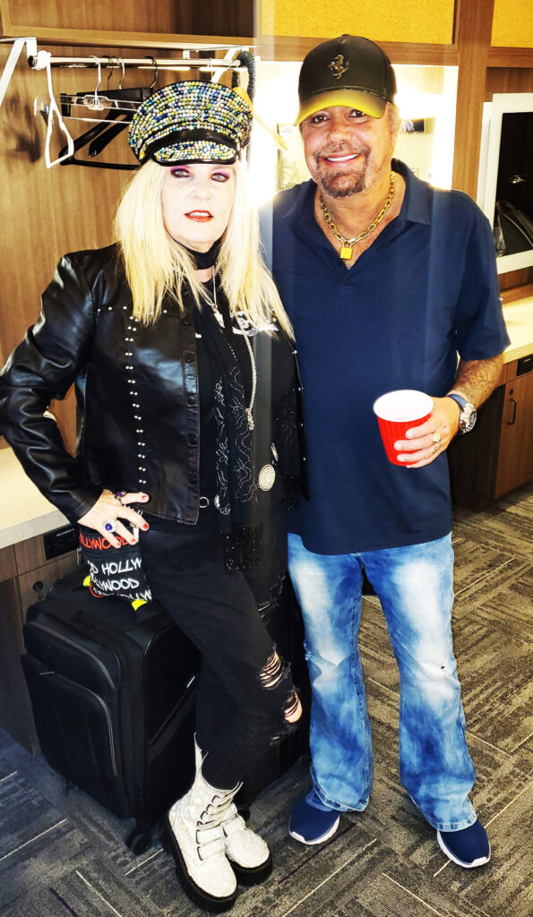 I hadn’t seen Vince since his stroke so as soon as I got to Vince’s dressing room I went straight to him and hugged him and told him how worried I had been about him. We made small talk and he told me how he loved living in Nashville. But I noticed I had to talk slow and repeat my questions. Poor Vince. He performed flawlessly onstage but his stroke must have really affected him in other ways. I had never seen Vince like this. He was very quiet and seemed a little bit vulnerable. After awhile I went up and hugged Vince goodbye and told him I missed him and he hugged me really tight holding me close to him and told me in my ear that he missed me too. I told him I loved him and then he looked me directly in my eyes and told me he loved me too. He looked like he was tearing up. I had to leave right away because I was almost in tears of sentimental emotion for a man I have known for over 20 years and was the centerpiece every month in my Vegas Rocks! Magazine. On the way down the hall I caught a glimpse of Tommy Lee’s dressing room and I saw him and John 5 and a crowd in there. There was a lively bash going on in there! But someone appeared in the hall before I got too close and said: “Who are you with!?!”. I told him Chris and the guy yelled for Chris who came and got me. (Always in trouble like I said! LOL).